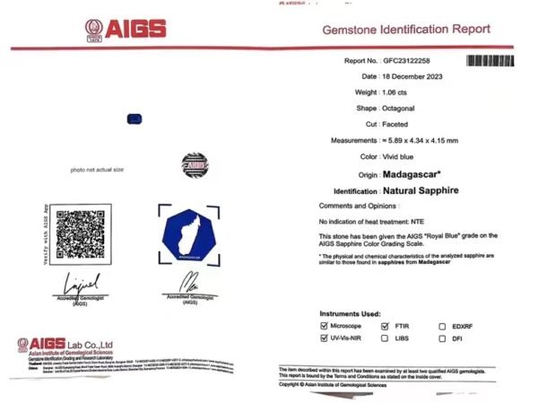 AIGS Certification: Rest assured that your sapphire’s authenticity and quality are upheld by the esteemed AIGS certificate, guaranteeing its exceptional brilliance and vibrant color.