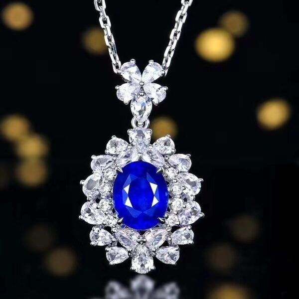This exquisite masterpiece features a captivating 1.98-carat oval-cut sapphire, renowned for its mesmerizing royal blue hue and unparalleled brilliance. The gemstone is meticulously hand-selected and expertly faceted to maximize its radiance, ensuring it catches the light with every movement.