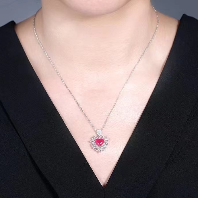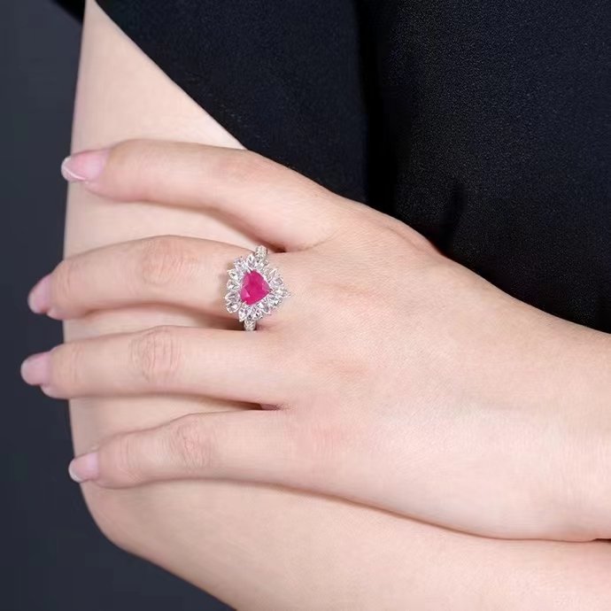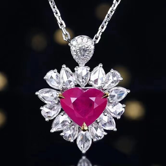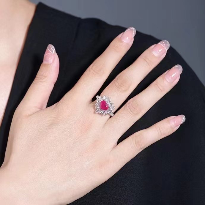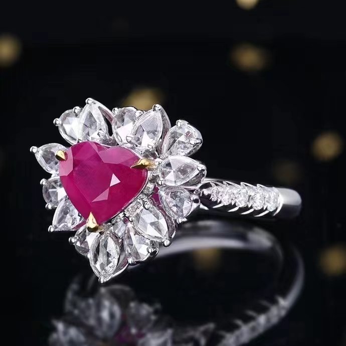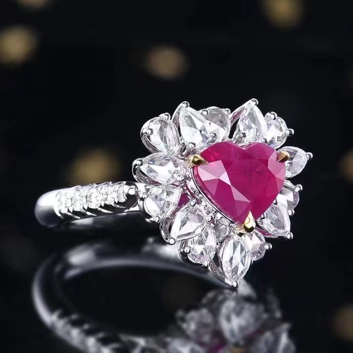 This captivating ring features a mesmerizing 2.65-carat Burmese ruby, renowned for its exceptional brilliance andPigeon Blood color. The heart-shaped cut exudes elegance and romance, symbolizing the depths of love and passion.