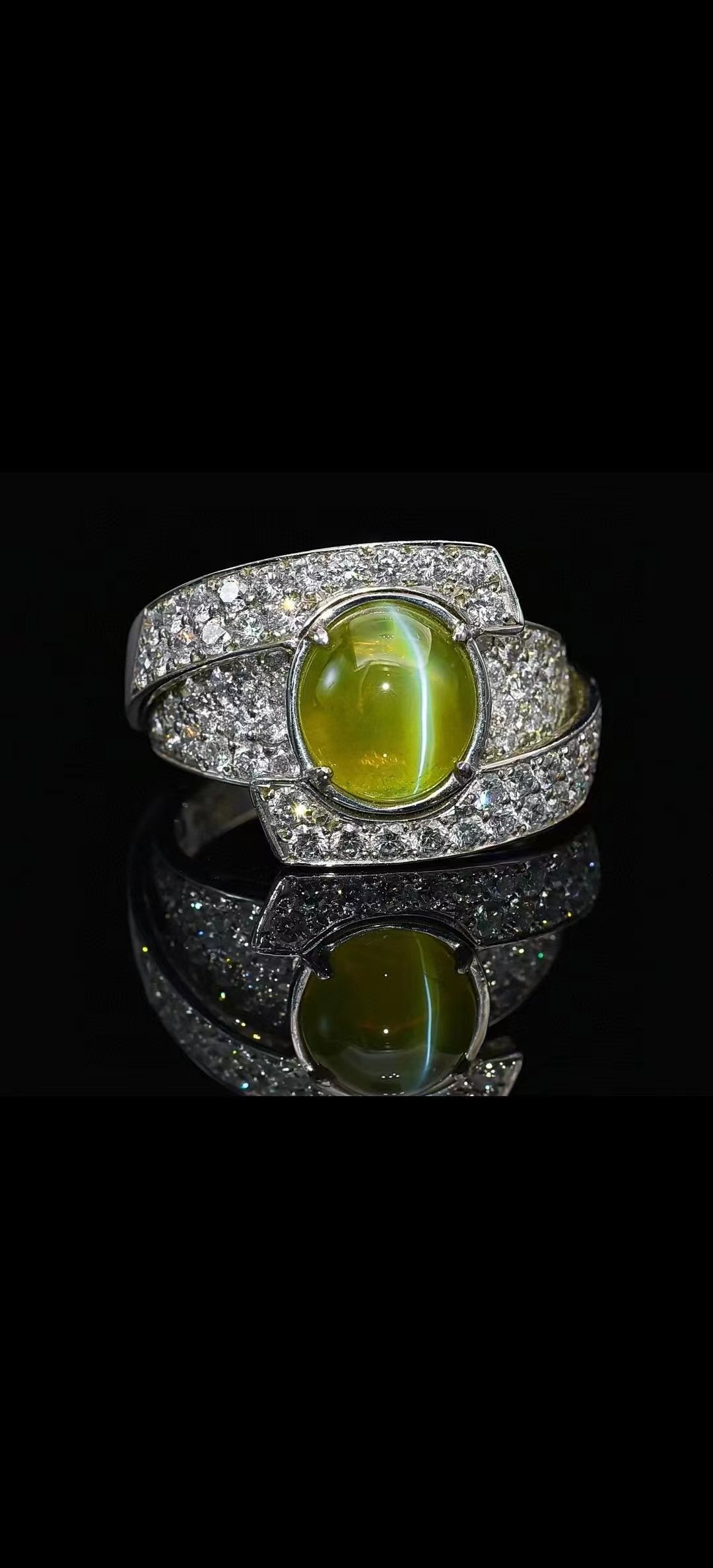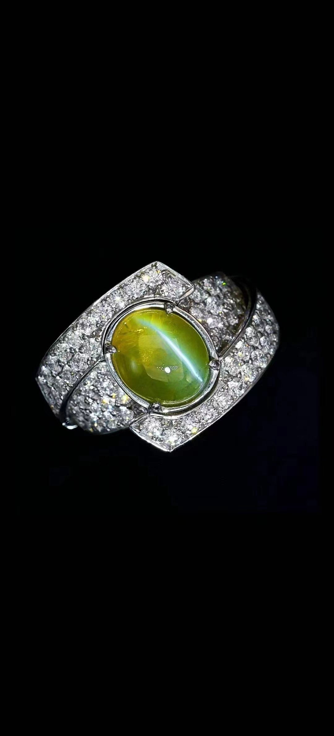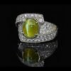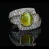 SGARIT Fine Jewelry Manufacturer 18k White Gold 4.03 Carats Oval Cut VVS Jewellery With Guild Certificate Meladze Golden green Natural Gemstone Cat’s eye ring
